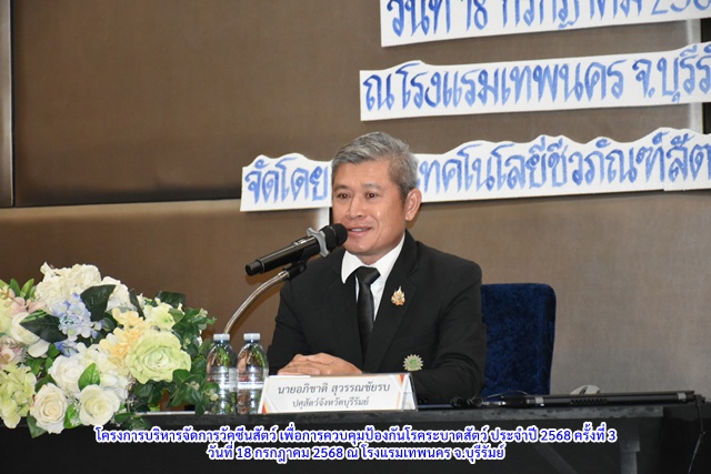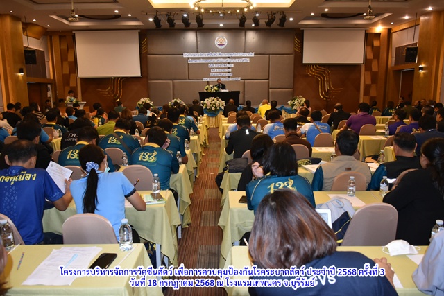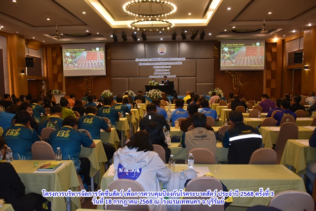 วันที่ 18 กรกฎาคม 2568 นายสัตวแพทย์อดิศร ชาติสุภาพ ปศุสัตว์เขต 3 มอบหมายให้ นายสัตวแพทย์อภิชาติ สุวรรณชัยรบ ปศุสัตว์จังหวัดบุรีรัมย์ เป็นประธานเปิดการโครงการบริหารจัดการวัคซีนสัตว์เพื่อการควบคุมป้องกันโรคระบาดสัตว์ ประจำปี พ.ศ.2568 ครั้งที่ 3 จัดโดยสำนักเทคโนโลยีชีวภัณฑ์สัตว์ การจัดโครงการฝึกอบรมในครั้งนี้มีวัตถุประสงค์เพื่อการติดตาม ประเมินผล และวิเคราะห์สถานการณ์การใช้วัคซีนสัตว์ และเพื่อเพิ่มประสิทธิภาพการเบิกจ่ายวัคซีนให้ครอบคลุมและแม่นยำตามความต้องการในพื้นที่ และมีกลุ่มเป้าหมายเป็นเจ้าหน้าที่กรมปศุสัตว์ในสำนักงานปศุสัตว์เขต ปศุสัตว์จังหวัด ปศุสัตว์อำเภอ และอาสาปศุสัตว์ ในพื้นที่ปศุสัตว์เขต 3 ณ โรงแรม เทพนคร จังหวัดบุรีรัมย์